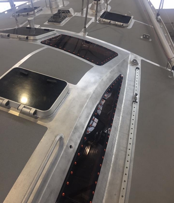 NB / je passe sur d'autres petits détails comme le changement du hublot de roof babord et celui de la cabine arriere, finalement ça se fait bien. Le changement des planches de teck du support capote (j'ai mis du 12 mm au lieu du 10 d'origine), changement des toles de support des panneaux solaires par du 6mm pris plus largement sur toute la surface de l'arceau, bcp plus solide ainsi.