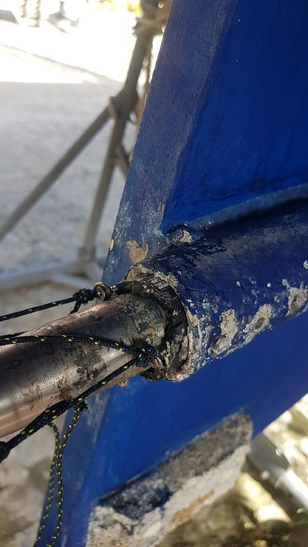 Il nous faut donc la remplacer par une de 100 mm, mais les trous des vis nylon qui servent a la bloquer ne correspondent évidemment plus a ceux dans le tube d'étambot.