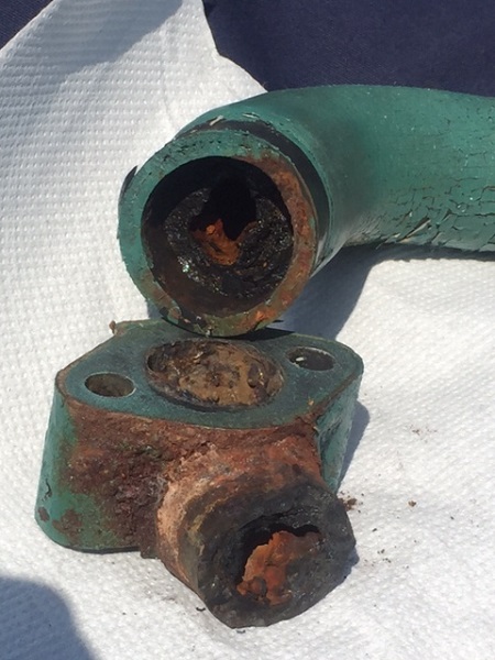 Lors du changement (préventif) de la durite reliant la sortie eau mer de l'échangeur au coude d'échappement, jai découvert que la pièce nommée "raccord" chez Marine Parts Volvo, était détruite (cf. photo). Mon moteur est de 2003 et en 2013 j'avais fait changer le coude car il m'avait été dit que cette pièce avait une tendance à la corrosion. Mon ancien coude était finalement très peu corrodé, mais des témoignages lus sur un autre forum indiquaient que ce coude pouvait présenter différentes qualité de métal, plus ou moins sensibles à la corrosion.