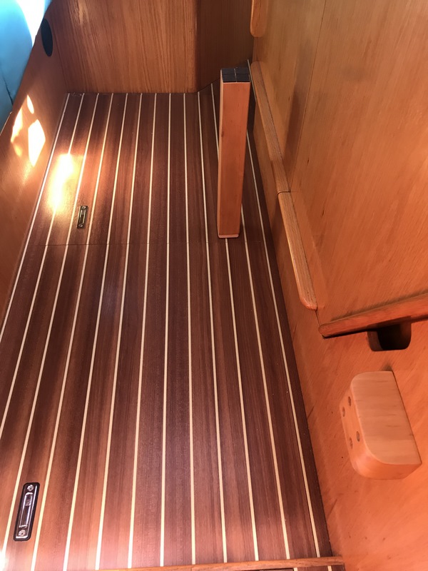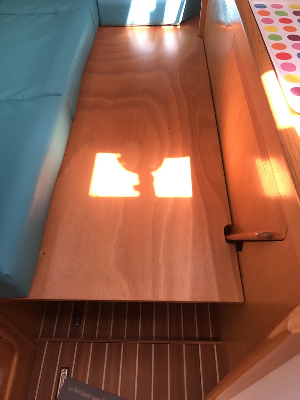 Planche de contre plaqué extérieur de 15 mm, stockée sous le matelas de la couchette arrière