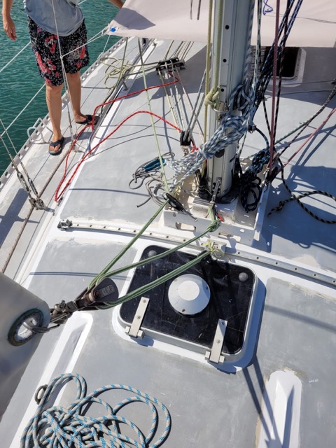 Bonjour à tous. Quelqu'un a-t-il un Ovni des années 1980 avec un foc auto-vireur ? Comment est l'écoute chez toi ? Nous ne voyons pas d'autre possibilité que de fixer l'extrémité de l'écoute et la poulie de renvoi au pied du mât. Mais cela tire le chariot de travelling vers le centre. Cela me semble bizarre. Comment cela a-t-il été pensé à l'origine ?