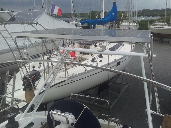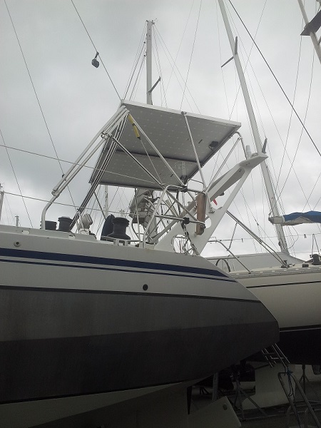 Nous devrions nous décider dans les jours qui viennent pour une solution de panneaux fixes de grande puissance : 2 x 327W (panneaux de 1,0m x 1,6m chacun), non orientables, et un bon parc batteries. Soit 2m x 1,6m au total. Je pense les fixer en appui sur le portique, mais pas directement au dessus, afin de garder de la place pour les diverses antennes, et de compléter le bimini. Je reprends un montage similaire à celui de Louis (Kayok).
